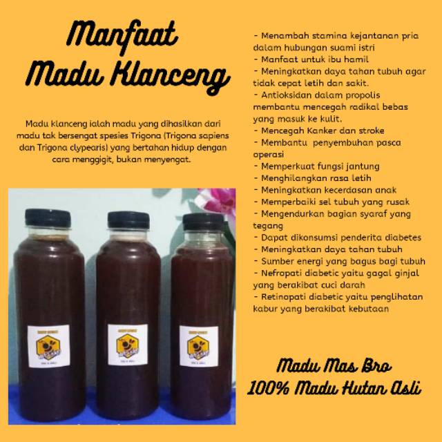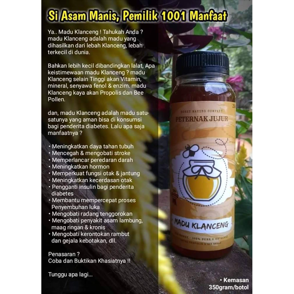 Tingkatkan sistem imundengan madu klanceng bantul jogja yang berdomisili di bantul yogyakarta siap melayani pesanan madu klaceng sleman madu klaceng kulon progo. Ini jenis lebah yang potongan tubuhnya lebih mungil dan tidak punya sengat seperti halnya koleganya yang populer sebagai sesama produsen madu yang gemar ngentup jika diganggu apis mellifera sp. Madu klanceng sebenarnya dihasilkan oleh lebah juga yang membedakannya adalah spesies lebahnya yaitu apis trigona sp.