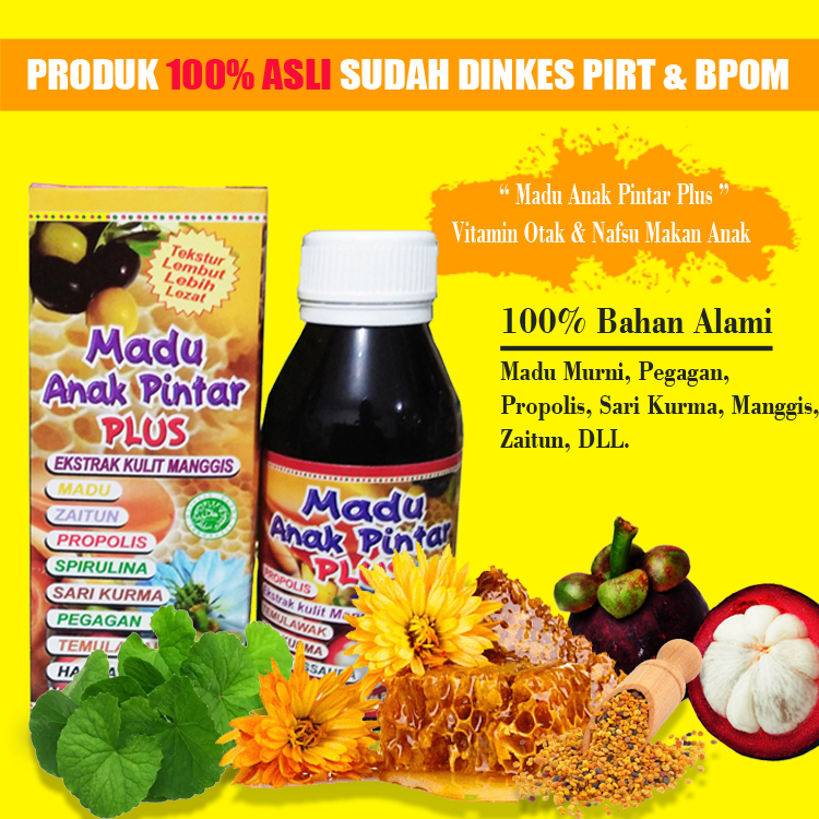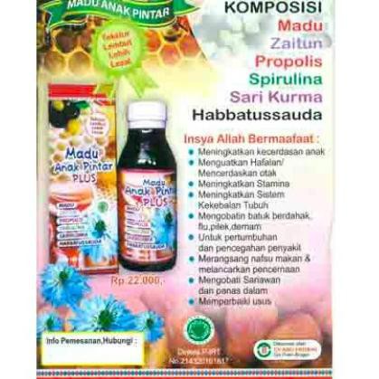 Madu anak pintar plus adalah herbal spesial untuk anak anda madu yang sengaja di formulasikan untuk mendampingi anak anda yang super aktif. Meningkatkan kecerdasan anak 2.