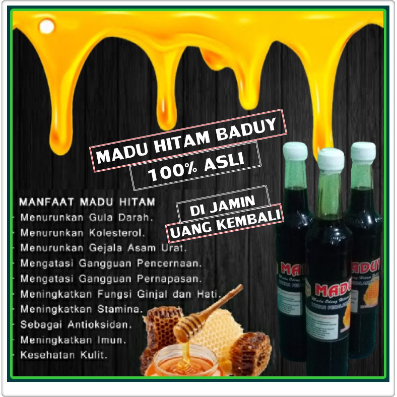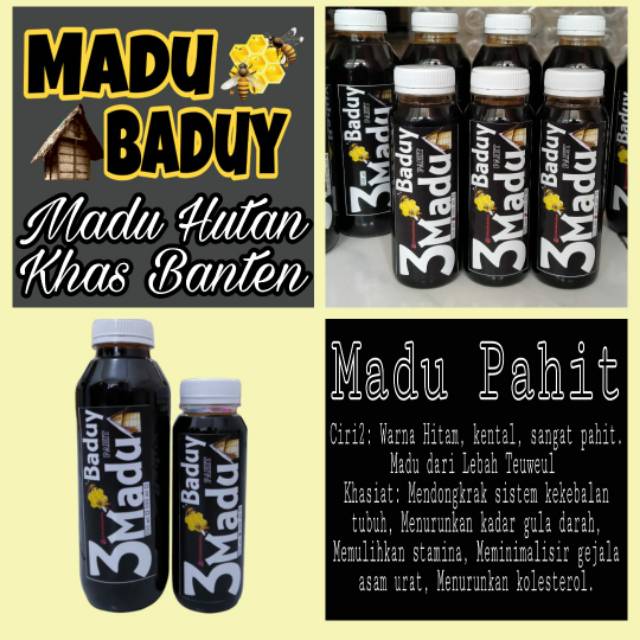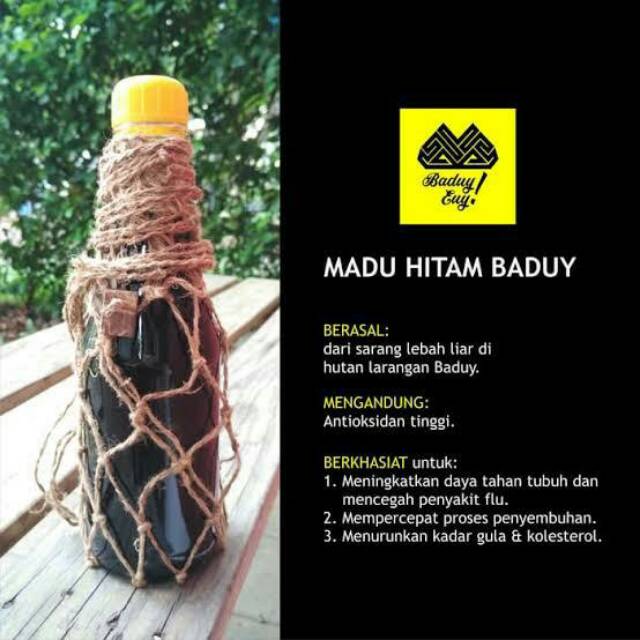 Madu hitam baduy. Kental kadar air dibawah 20 hitam pekat. Karena diambil di dalam lubang pohon pohon kering dihutan. Madu hitam baduy sudah terbukti manfaatnya dapat membantu atasi macam2 keluhan kesehatan yang di rasakan oleh tubuh manusia.