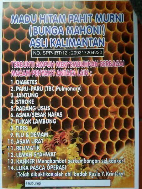 Madu murni yang berasal dari tawon lebah memang sangat banyak sekali manfaat dan kegunaanyatetapi pada kali ini bukan untuk menceritakan kegunaan dan manfaat dari madu murni karena ini sudah pernah ditulis artikel lainnya madu murni dan asli beribu manfaat tetapi pada kesempatan kali ini hanya ingin bercerita tentang karakteristik madu hutan yang murni serta asli. Inilah yang menyebabkan rasa pahit dan juga warna hitam pada madu tersebut karena diambil dari pohon mahoni. Dari segi kualitas madu hutan kalimantan madu organik berwarna hitam pekat lebih baik daripada madu yang di.