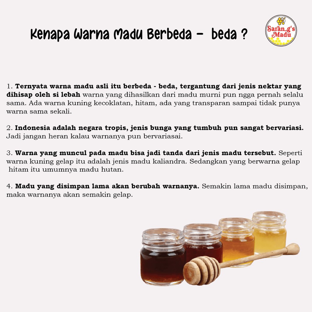 Warna warni yang terjadi pada madu hutan asli ini adalah hal yang biasa jika kamu adalah penggemar madu. Madu kuning sehat lambung meningkatnya testimoni buktikan khasiat yang nyata. Sebelumnya kami pun sependapat bahwa perbedaan warna pada madu lebah trigona dipengaruhi oleh sumber nectar dan usia madu dalam pot.