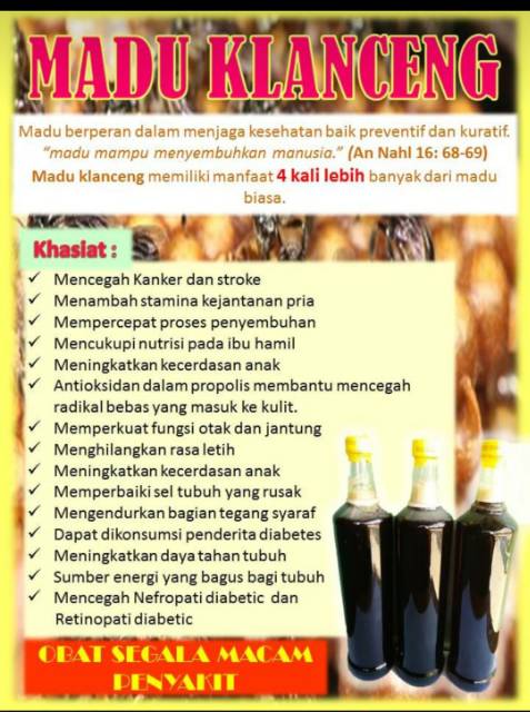 Siapa tak kenal madu. Madu klanceng bermanfaat untuk kesuburan asam lambung dan kejantanan tanpa efek samping. Entah asal mulanya mereka mendapat pengetahuan atau testimoni dari siapa atau cuma ada kesamaan istilah.
